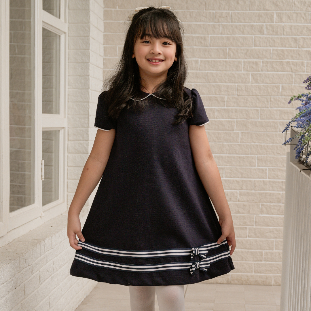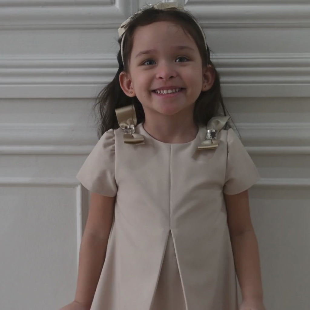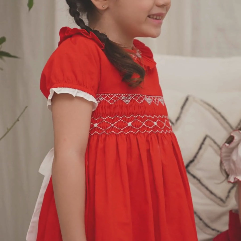 Young girl wearing a red dress with a bow, standing against a neutral background with 'Periwinkle' branding.