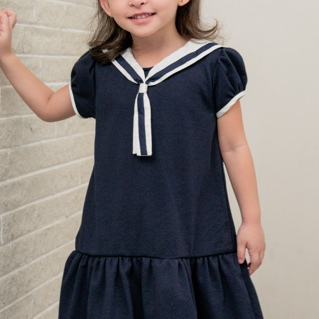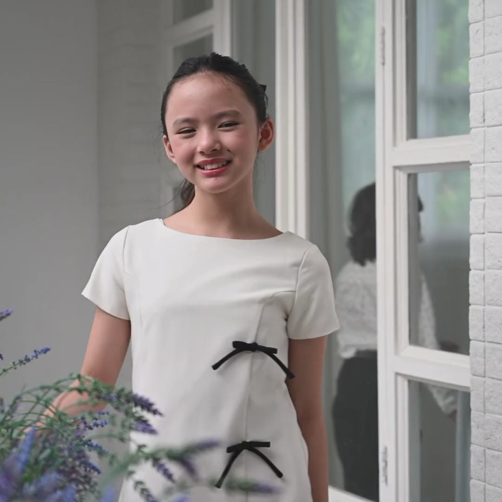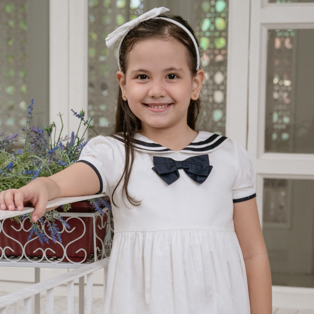 Young girl wearing a red dress with a bow, standing against a neutral background with 'Periwinkle' branding.